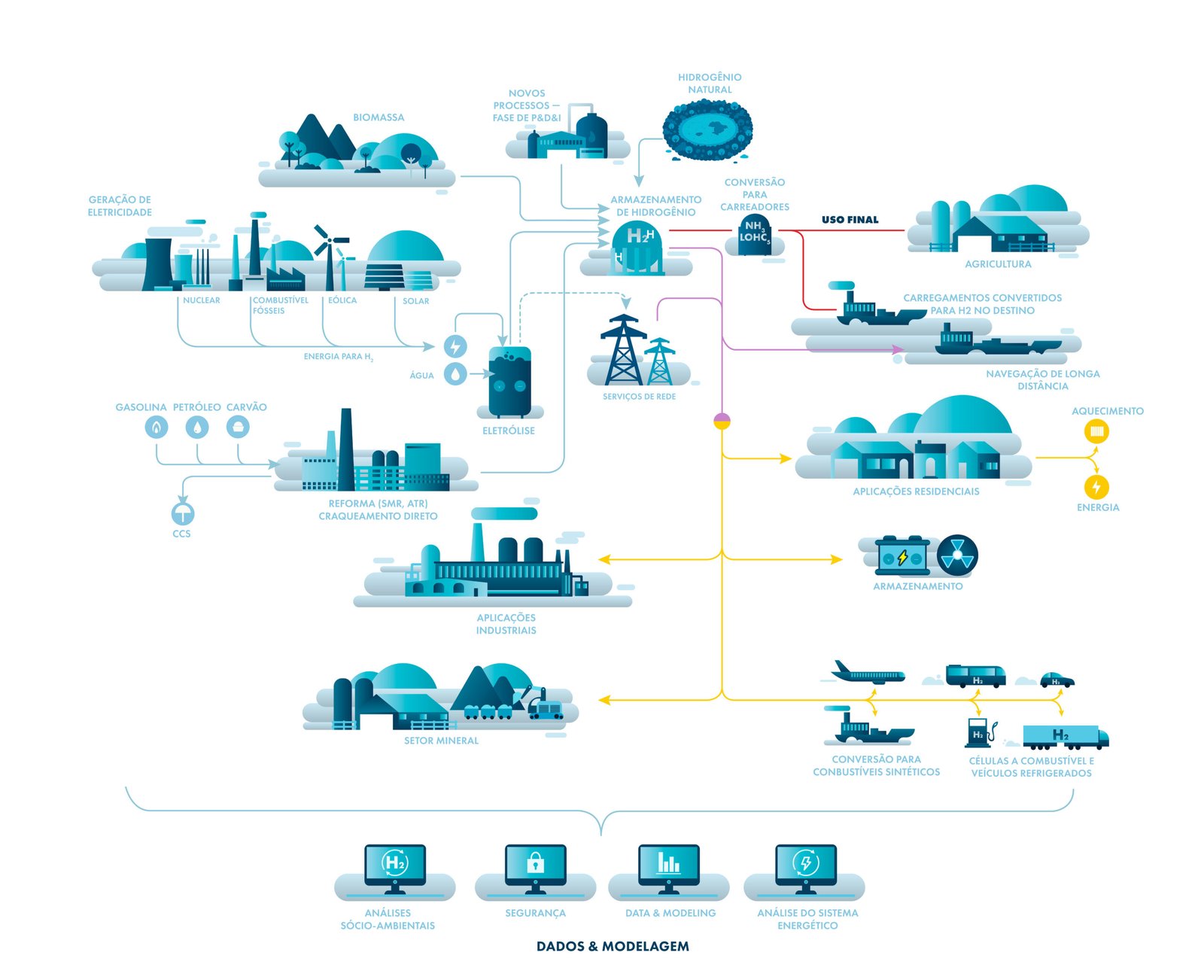 A cadeia de valor do hidrogênio no Brasil pretende abranger desde a produção até o consumo final, passando por etapas de armazenamento, transporte e distribuição. O país possui um potencial significativo para se destacar nesta cadeia de valor devido à sua matriz energética predominantemente renovável
