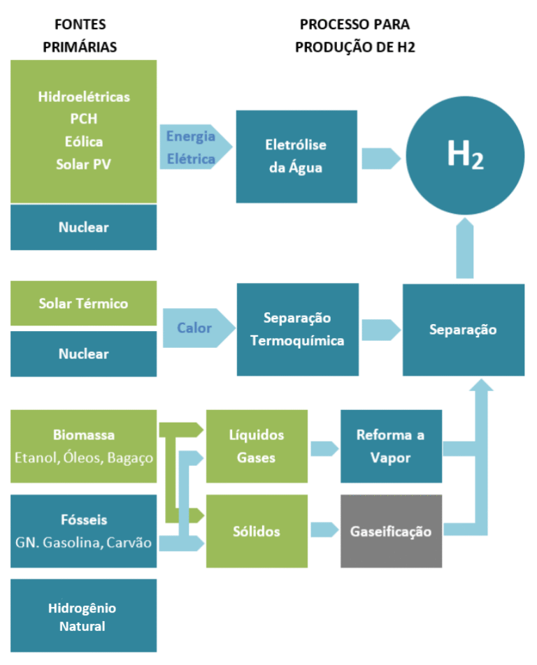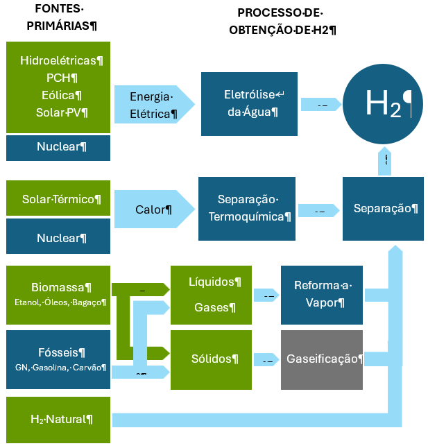 O hidrogênio é o elemento mais abundante do universo e está presente na composição de diversas substâncias, como água, hidrocarbonetos (petróleo e gás natural) e biomassa. Sua produção pode ser realizada por diferentes rotas tecnológicas e fontes energéticas, conforme ilustrado na figura abaixo. Além disso, também ocorre naturalmente em reservatórios substerrâneos, sendo sua extração outra possibilidade de obtenção de hidrogênio. Isso permite o aproveitamento de uma ampla variedade de fontes, incluindo gás natural, carvão mineral, energia eólica, solar, bioenergia, nuclear e resíduos agroindustriais, muitas vezes distribuídas regionalmente.